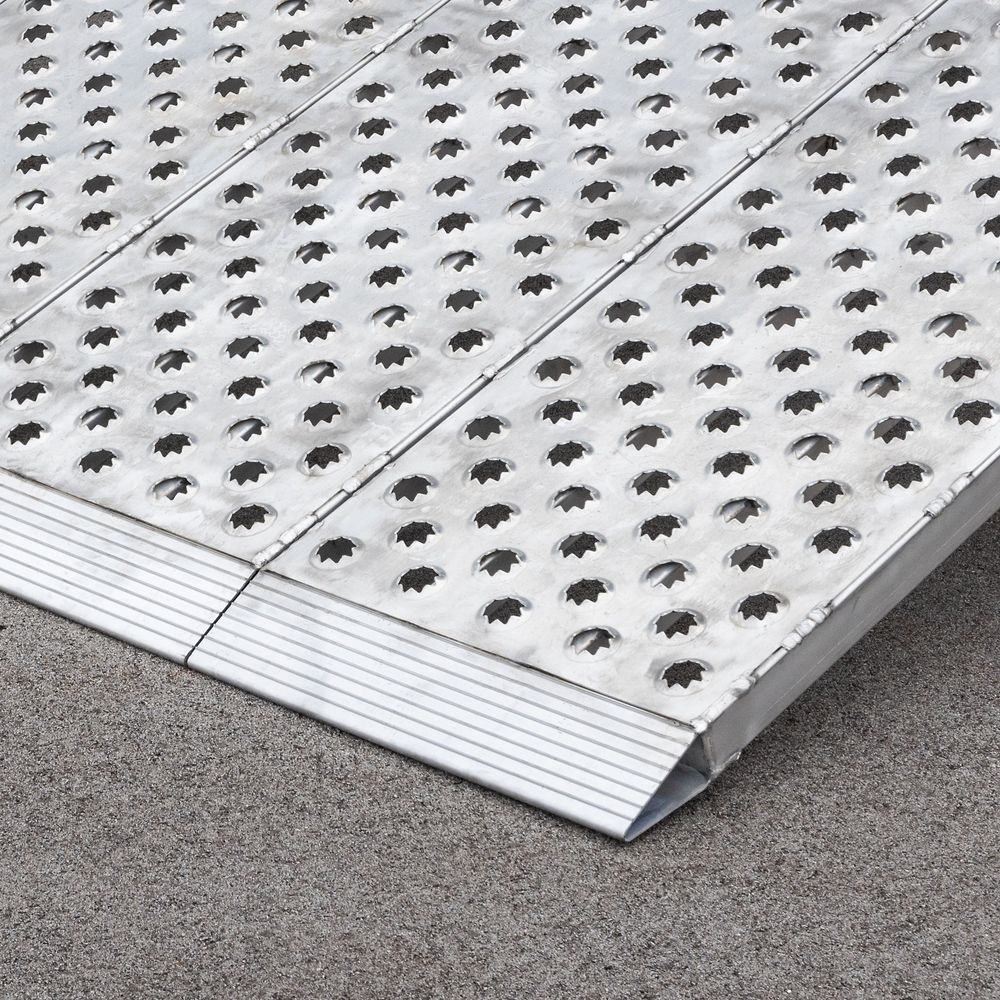Made in the USA of strong, lightweight aluminum, the ramp system features exclusive EZ Traction punch plate for superior non-slip grip in all weather conditions. The tapered knife foot and deep-lipped top plate create a smooth transition on and off the ramp. The four ramp sections are securely connected so they move as a single unit. The entire ramp system supports 3,000 lb. per axle.
