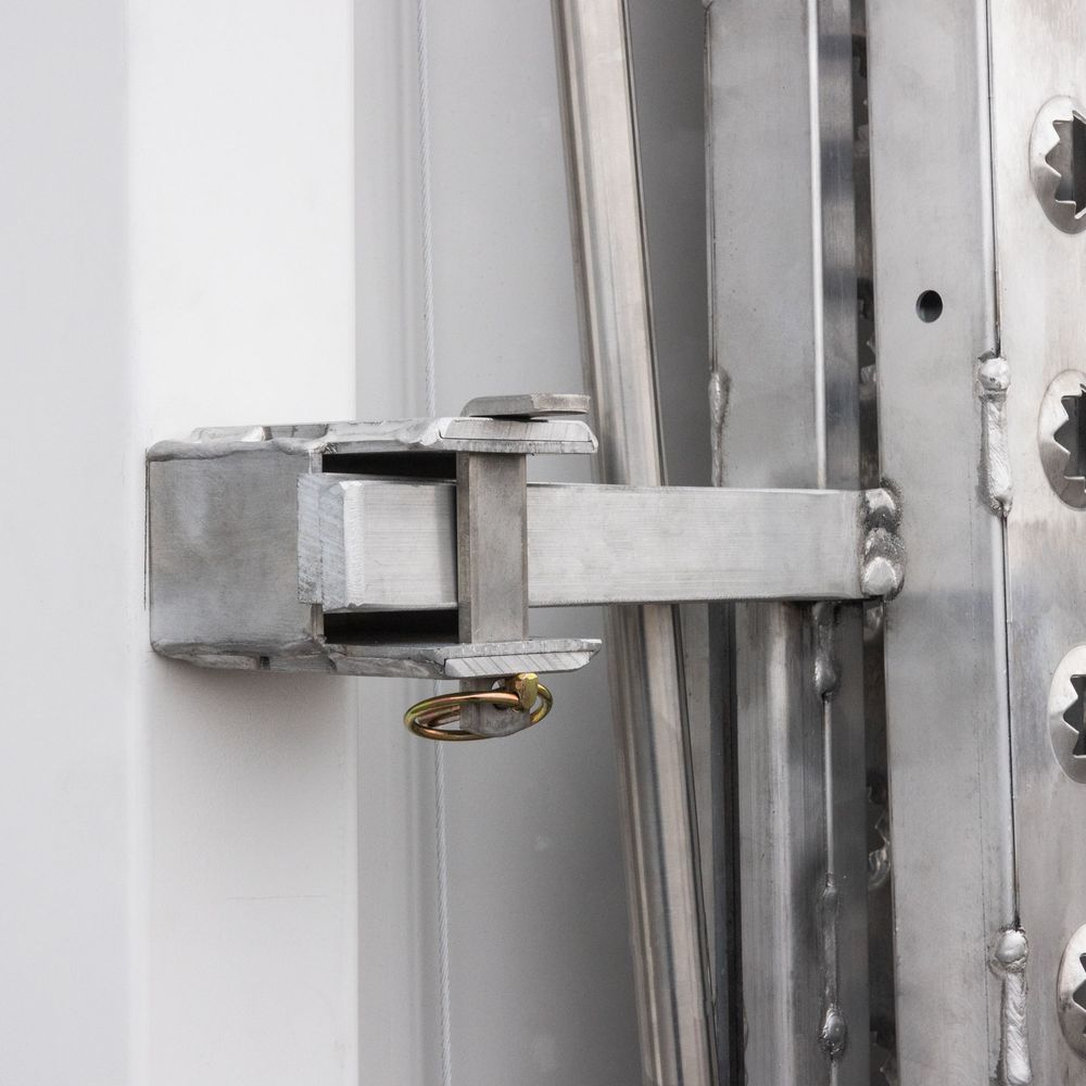 The adjustable compression gas shocks offer more safety than traditional extension springs and can be adjusted easily to increase or reduce the effort required to raise and lower the ramps. Once raised, the ramps latch securely to the box truck with rust-resistant aluminum latch brackets and stainless steel keepers. The latches can be locked if desired (padlock not included) for additional security.