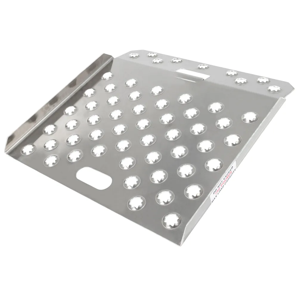 This portable, lightweight curb ramp features aggressive punch plate traction that prevents rain, mud, or snow build-up for safe use in all seasons.