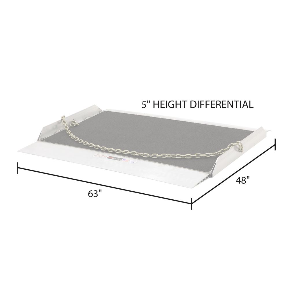 The dock board features a knife foot to smooth the ground to ramp transition and has a commercial-grade epoxy grit coat surface for ultimate traction in all weather conditions. It's suitable for a 5" height differential and comes with a 72" lifting chain to facilitate moving it with a forklift.
