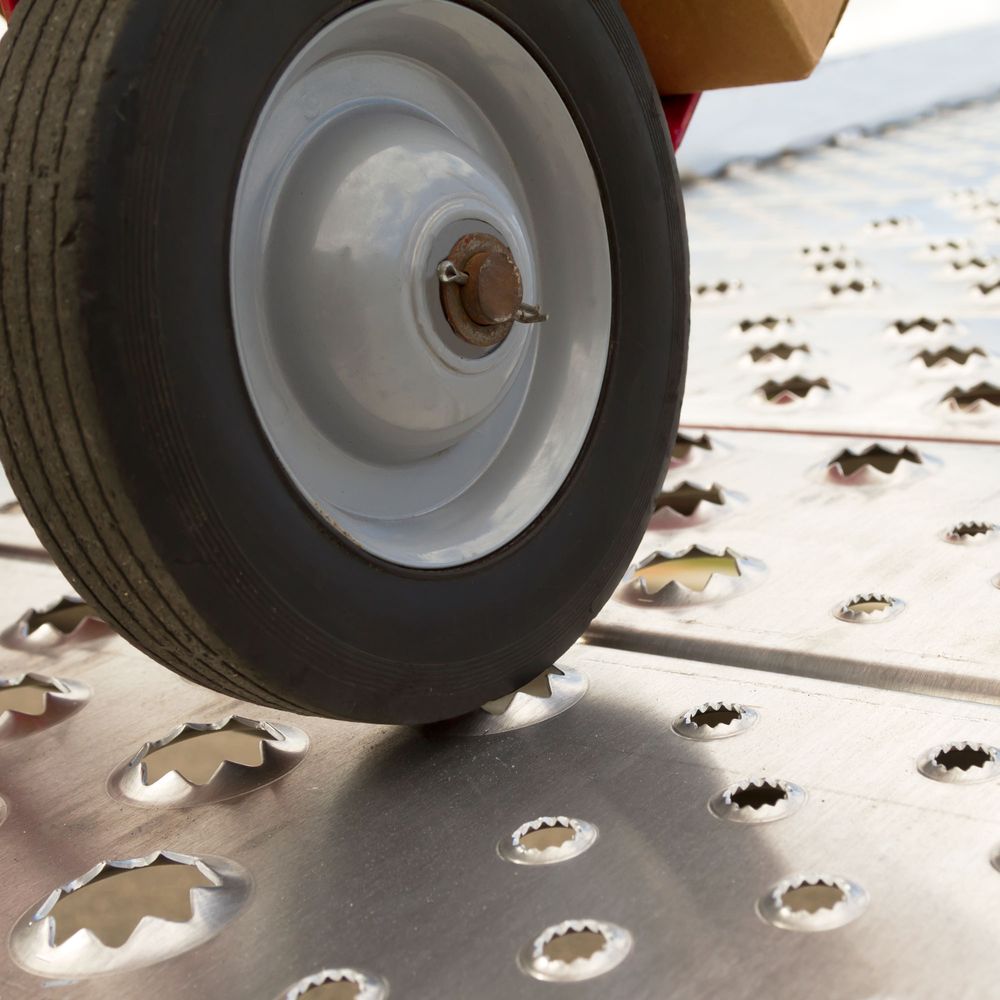 The aggressive traction pattern up the middle of the ramp offer superior foot traction while the punch on the outside of the ramp allows dollies to roll smoothly.